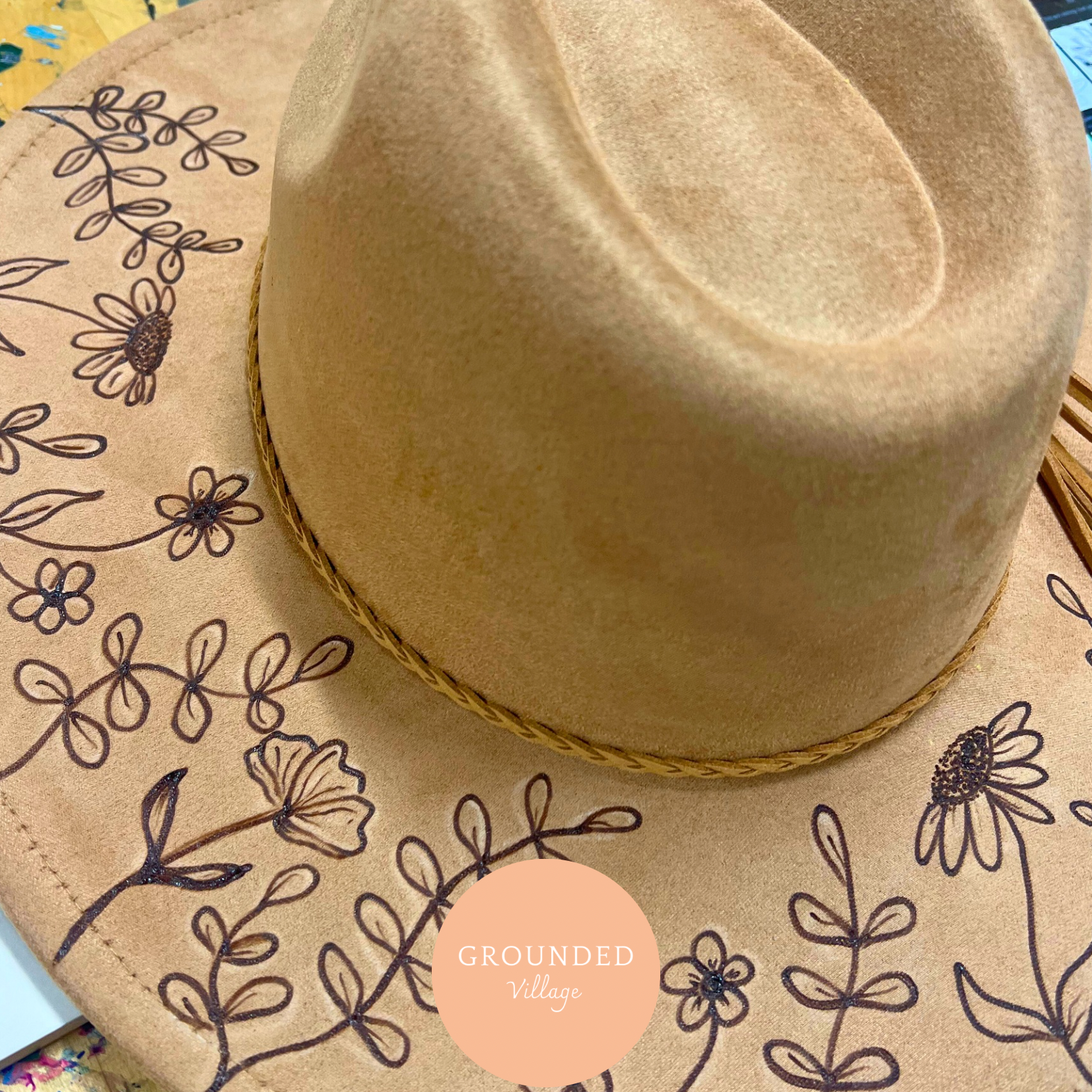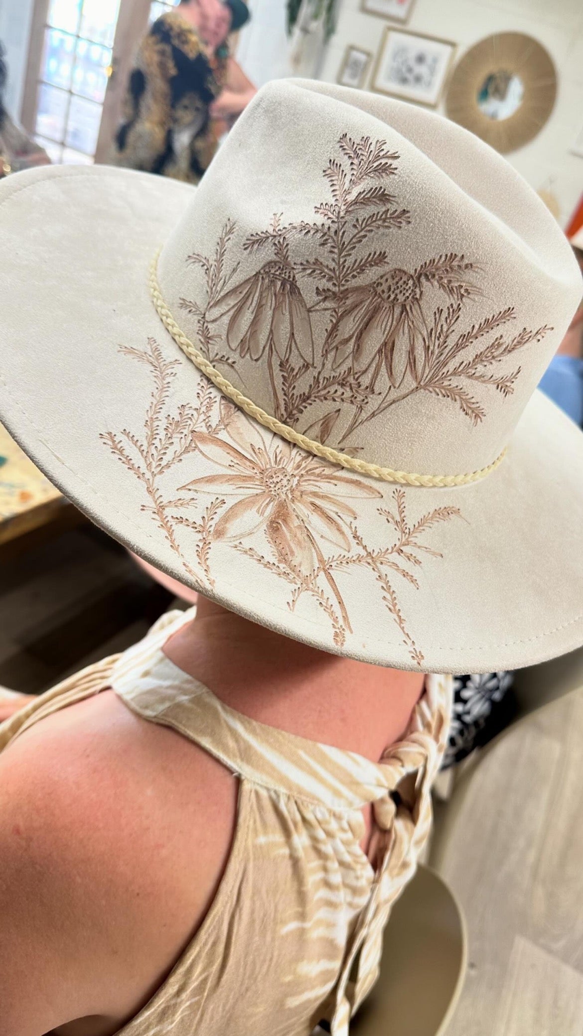 When you are finished burning you have the option to layer your hat with braided leathers, feathers and textiles to make it you own- a piece of art!